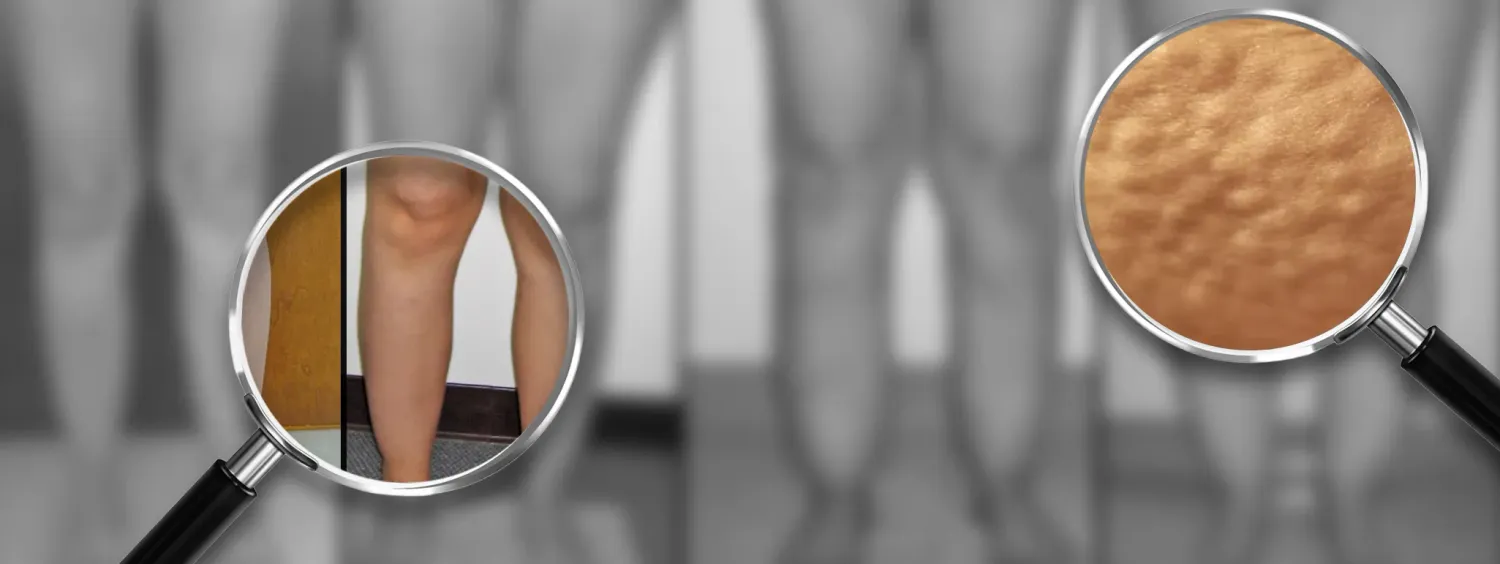 Skóra ma grudkowatą strukturę podobną do cellulitu – ale z wyczuwalnymi pod palcami twardszymi guzkami, jak ziarnka grochu